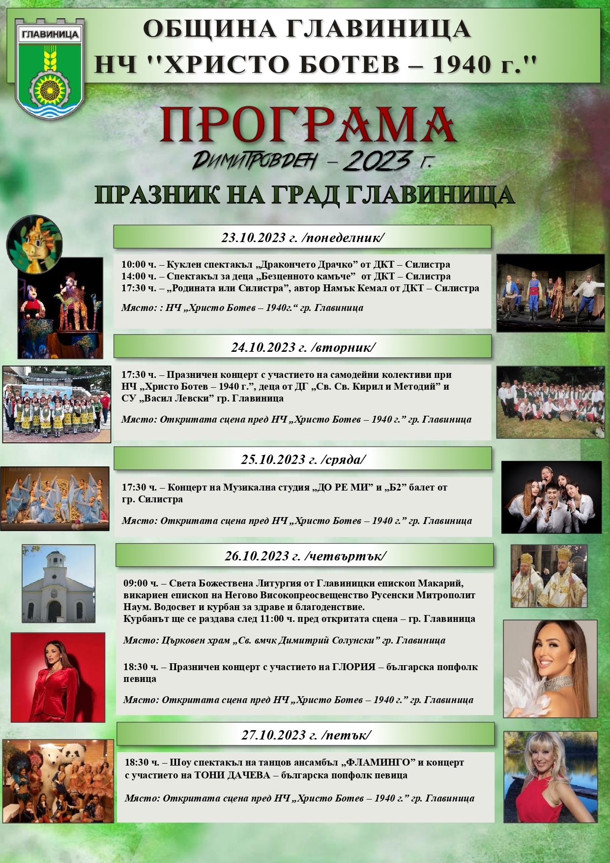 Община Главиница ще отбележи Димитровден, празник на града, с богата програма, която включва театрални постановки, концерти, фолклорни изпълнения и кулинарни изкушения.