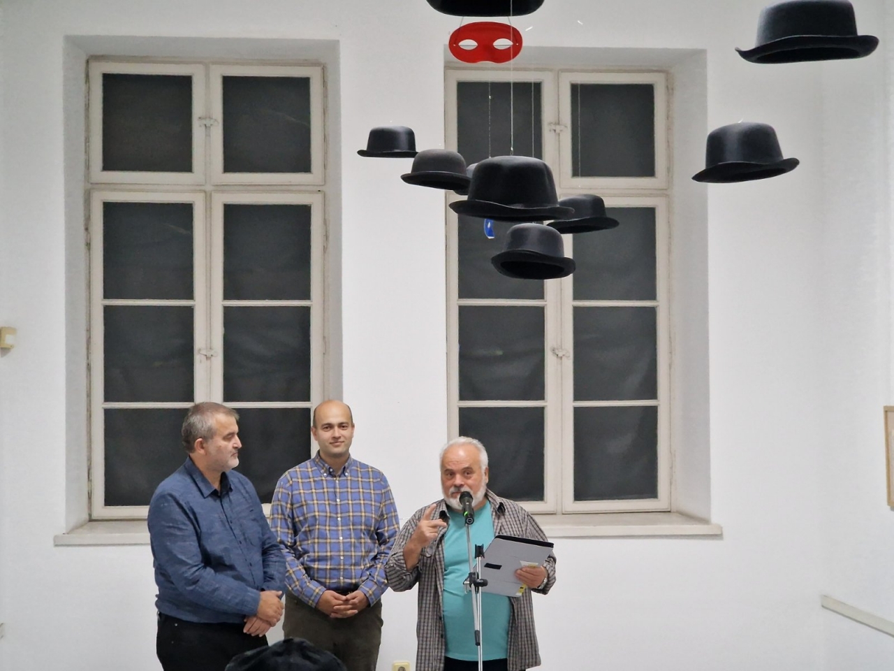Специално заради автора от тавана на галерията бяха спуснати мъжки бомбета, аксесоар станал неотделима част от образа на Рене Магрит.
