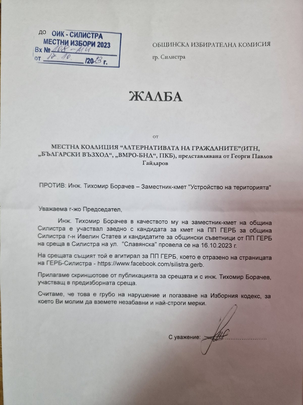 Местната коалиция "Алтернативата на гражданите" (ИТН, "Български възход", "ВМРО-БНД", ПКБ), представлявана от Георги Павлов Гайдаров, е подала днес жалба с вх.№ 108 срещу инж. Тихомир Борачев – Заместник-кмет "Устройство на територията".