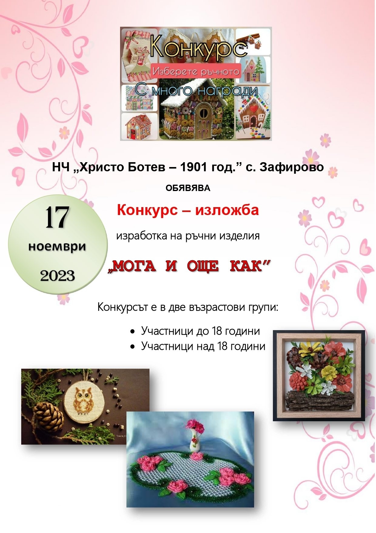 Народно читалище "Христо Ботев" - село Зафирово, община Главиница. С краен срок 17 ноември т.г. е обявеният конкурс за ръчни изделия в две възрастови групи (на афиша), съобщава РЕКИЦ-Силистра. В местното училище е един от най-активните клубове - школа по изобразително изкуство, носител на многобройни награди.