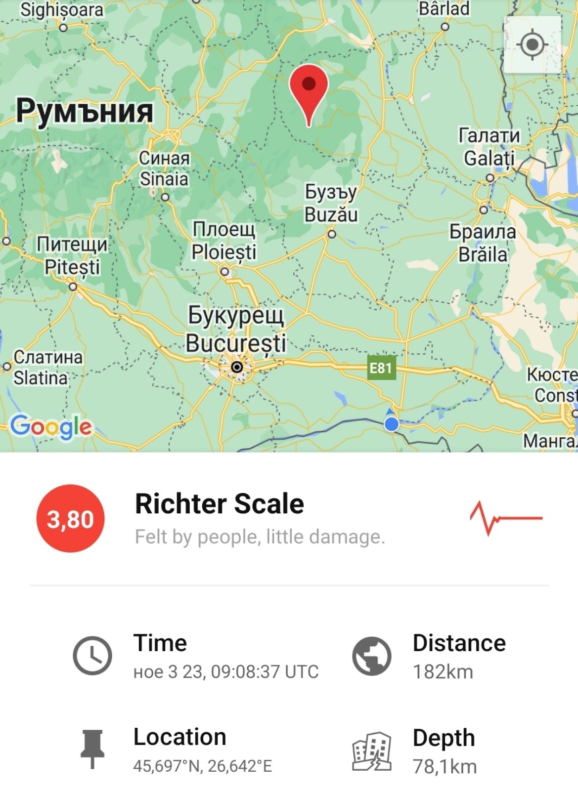 Трусът е бил с магнитуд 3,8 по скалата на Рихтер и е регистрирано в сеизмичната зона на Вранча, окръг Бузау, по данни от Националния изследователски институт за физика на Земята (INCDFP).