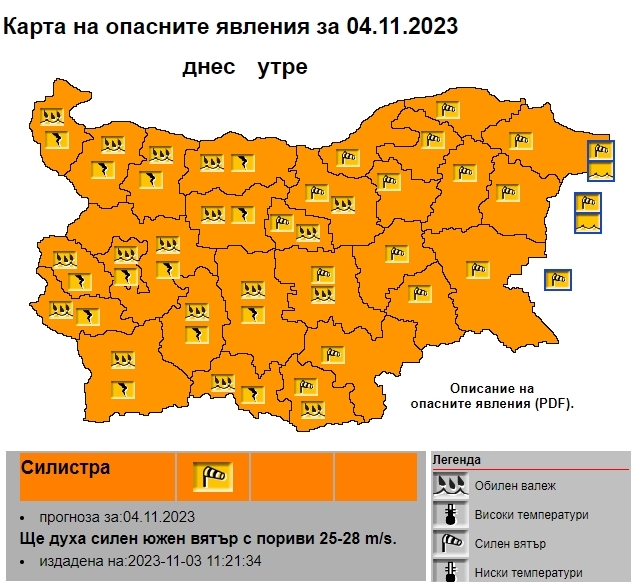 За утре е обявен оранжев код в цялата страна, съобщиха от Националния институт по метеорология и хидрология (НИМХ).