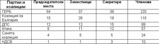На продължилите близо 7 часа консултации пълномощниците се договориха разпределението на местата да е съобразено с квотите в действащия парламент. Така ГЕРБ получи 349 места в комисиите, Коалиция за България – 175, ДПС – 133, партия «Атака» - 85, Синята коалиция – 33 и НДСВ – 15 места.