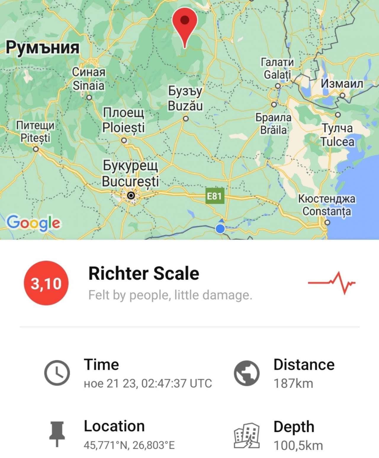 На 21 ноември 2023 г., в 04:47:37 часа (българско време), слабо земетресение с магнитуд 3,1 по Рихтер е станало в Румъния.