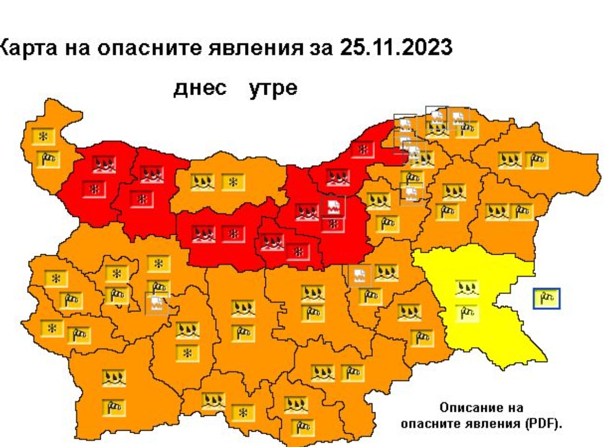 Поради преминаване на дълбок циклон в периода 25-26.11.2023 г. от север ще нахлуят студени арктически въздушни маси. Очаква се силен до бурен вятър, валежи от дъжд, който ще преминава в сняг,, тогава са възможни и заледявания. Очакваните сумарни количества са от 35-40 /м2, а на места и до 60-65 l/m2. Ще се образува снежна покривка в областта между 20 и 30 см. Поради силния вятър, който ще продължи и в неделя, след спиране на валежите ще има преспи и навявания.