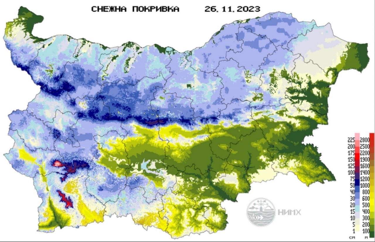 Цветната скала, посочената на картата показва: лява скала - височина на снежна покривка в cm; дясна скала - надморска височина в m за местата без снежна покривка.