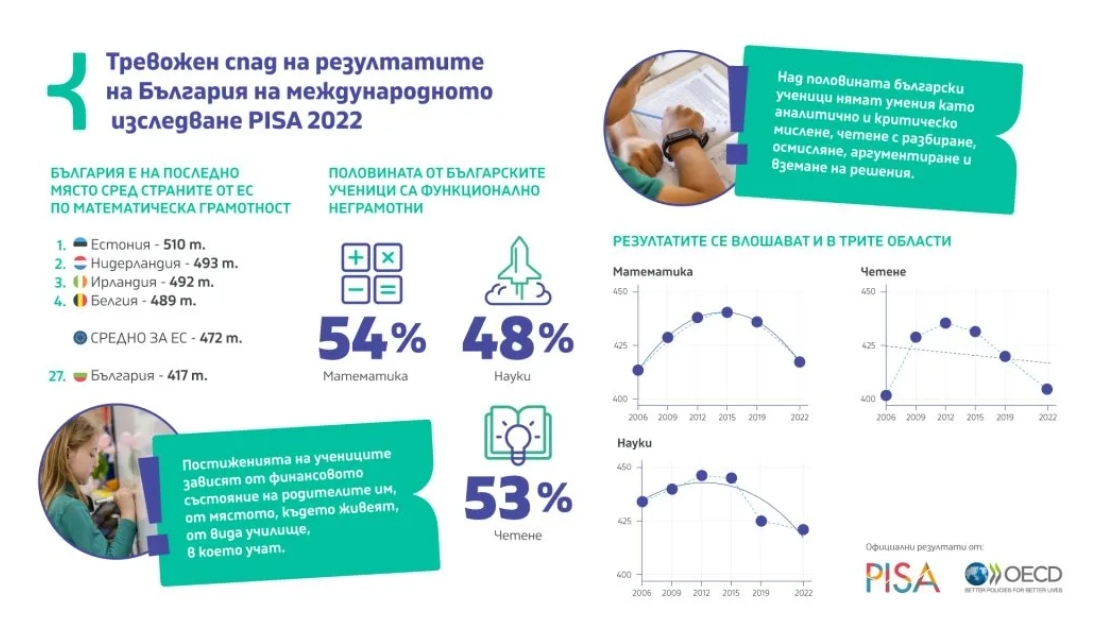 54 процента от българските ученици са под критичния минимум на знания и умения по математика, 53 на сто нямат елементарни четивни умения, а 48 процента са със сериозни дефицити по природни науки. Това сочат най-новите резултати от Програмата за международно оценяване на ученици ПИЗА (PISA) за 2022 година.