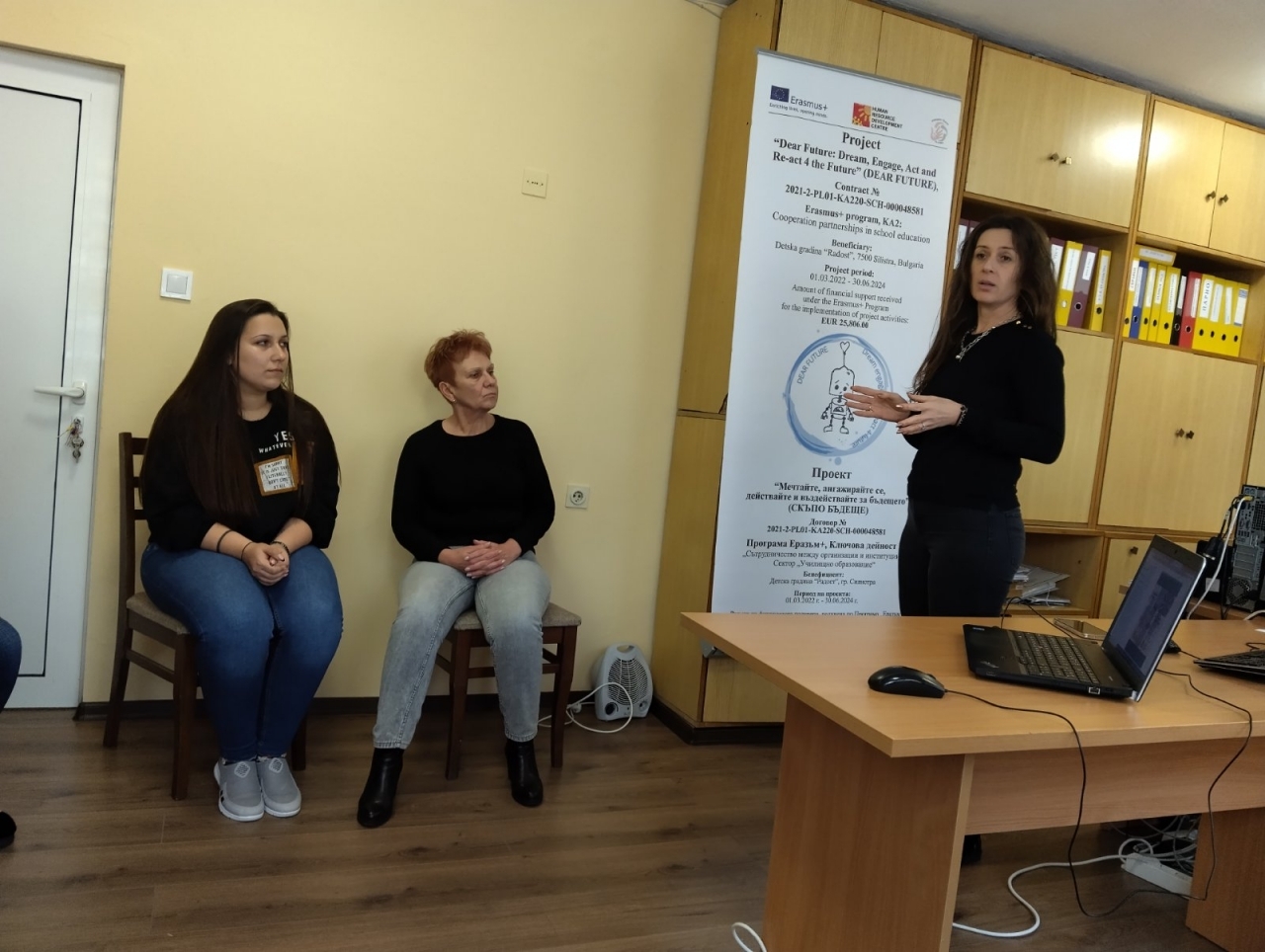 В изпълнение на дейностите по Проект 2021-2-PL01-KA220-SCH-000048581 "Dream, Engage, Act, and Re-act 4 the Future (DEAR FUTURE)", финансиран по програма Еразъм +, Ключова дейност 2 – "Сътрудничество между организации и институции", сектор "Училищно образование", като част от Пилотен план за изпълнение, г-жа Силвия Пенева, Директор и педагогически специалисти от ДГ "Радост", гр. Силистра, представиха на колеги в сферата на предучилищното образование разработените по Проектен Резултат 1 материали – електронна книги и планове за уроци за въвеждането на дигитален, иновативен образователен пакет, свързан с влиянието и използването на изкуствен интелект /AI/ в предучилищното образование и обогатяване уменията на учителите в предучилищна възраст за това как да преподават AI чрез иновативен, интерактивен, игрово базиран подход за разказване на истории.