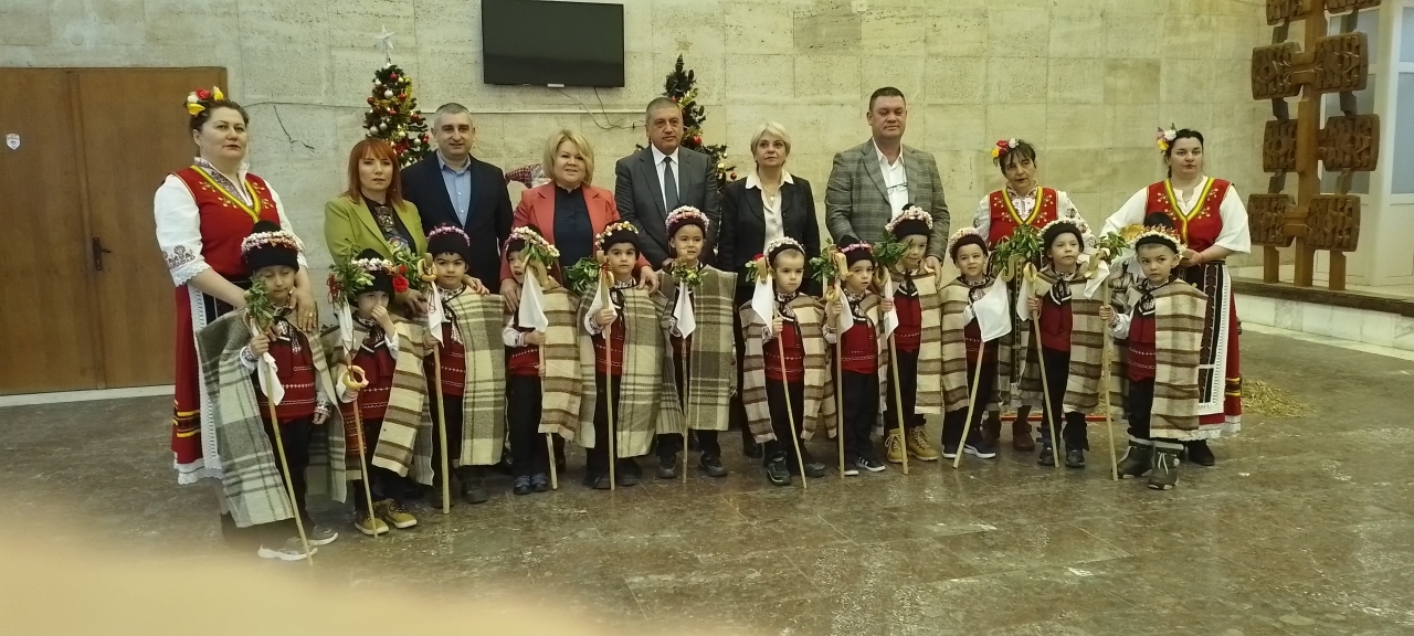 Под звуците на гайда и тъпан коледарчета от ДГ "Мир" влязоха в сградата на общината и накараха присъстващите, служители и посетители, да се усмихнат и да се заредят с празнично настроение за идващите празници.