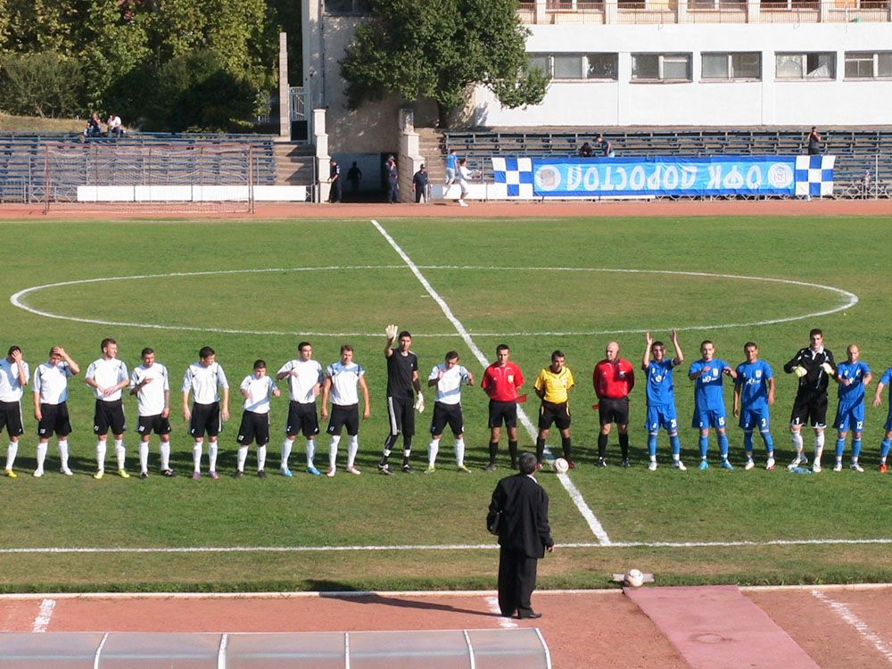 Точно в 16.00 часа главния съдия на срещата Атанас Димитров от Сливен даде първия начален сигнал на мача на стадион "Луи Айер" пред погледа на не повече от 200 зрители.