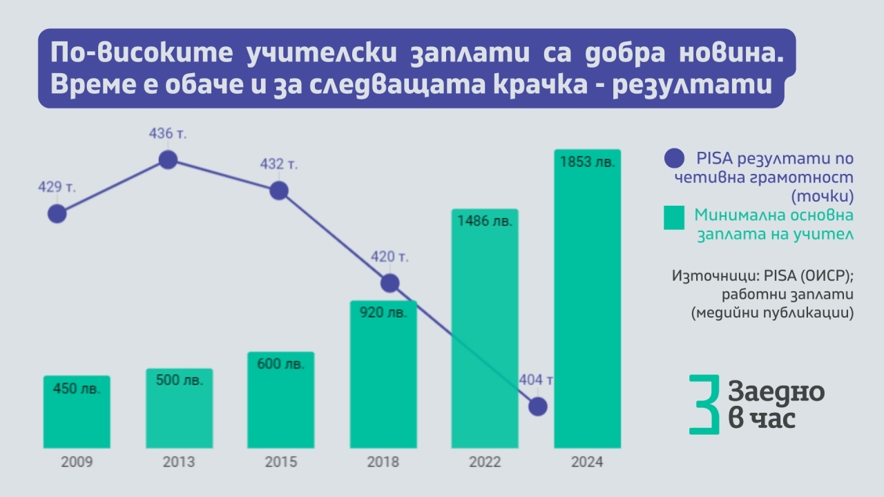 "За разлика от възнагражденията в образователната сфера обаче, има нещо, което през последните години не се увеличава, дори напротив - намалява. Това са резултатите на учениците. Когато миналия месец бяха оповестени данните от последното издание на PISA (Програмата за международно оценяване на учениците на Организацията за икономическо сътрудничество и развитие), България се нареди на последно място по математика сред държавите в ЕС и на предпоследно по четивна грамотност и природни науки. Резултатите на българските 15-годишни са сред най-ниските откакто държавата ни участва в PISA", отбелязват от фондацията.