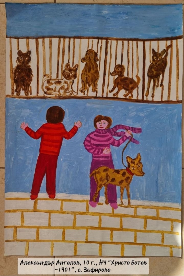 С второ място в категория "Рисунка" (7 – 12 години) се отличи Александър Ангелов, с. Зафирово, обл. Силистра. Неговата рисунка завладява с топлината на доброволната грижа за изоставени животни и даването на втори шанс за тях за щастие, топлина, прегръдка.