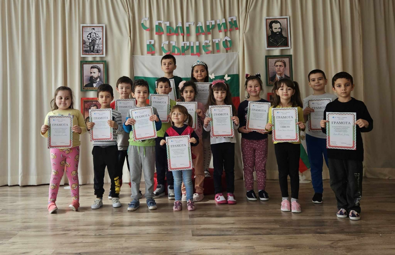 Над 20 деца от трета и четвърта групи в ДГ "Мир" се включиха във вътрешния етап от Тридесет и четвъртия рецитаторски конкурс "С България в сърцето" днес.