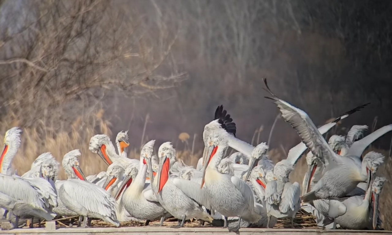 Екип на Българско дружество за защита на птиците BirdLife Bulgaria наблюдава оживената дейност на колонията от пеликани, където в момента се вихрят ухажване, строеж на гнезда, спорове за място на платформата, скандали за гнездови материал, копулация и мътене.