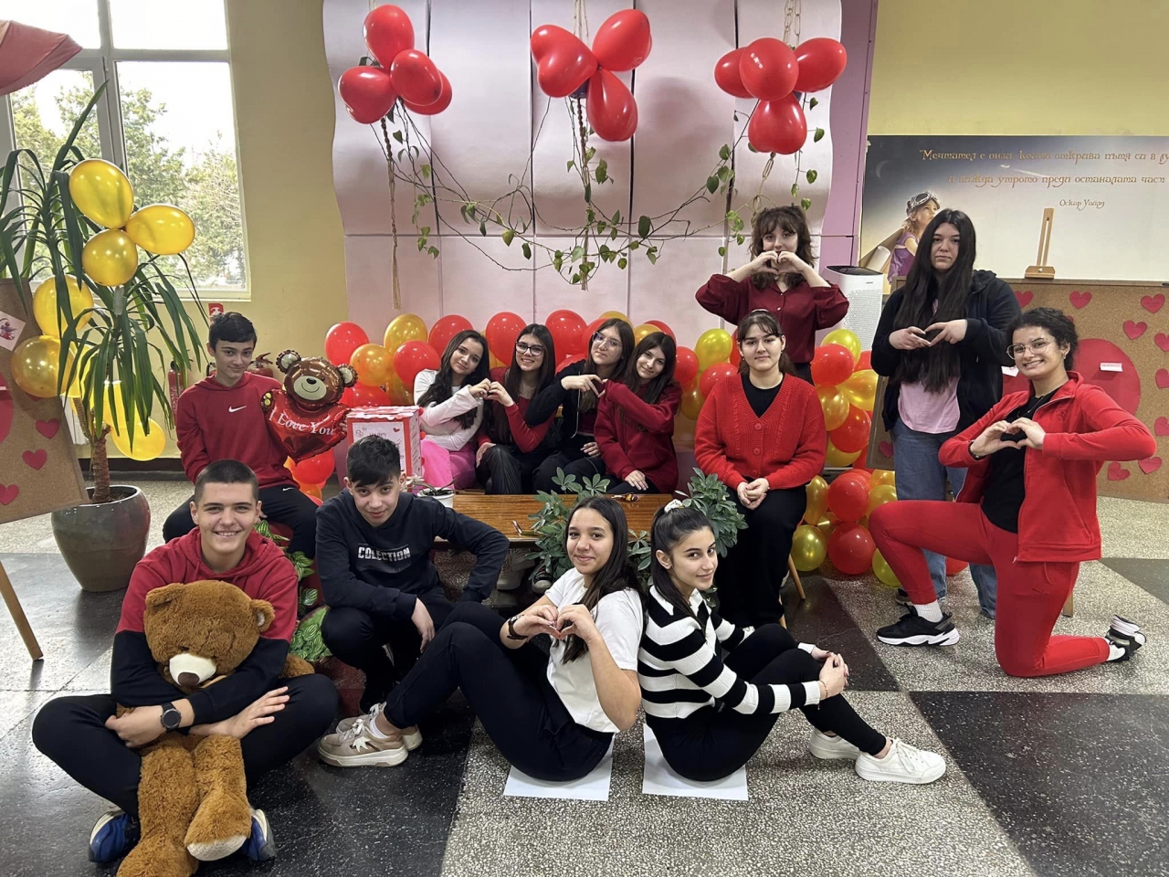 На входа на училището, всеки беше посрещнат с червени балони във формата на сърца и малки валентинки, изпълнени с пожелания и послания за приятелство. Фоаето беше превърнато в истински център на вълненията, като беше украсено със символи на празника на влюбените.