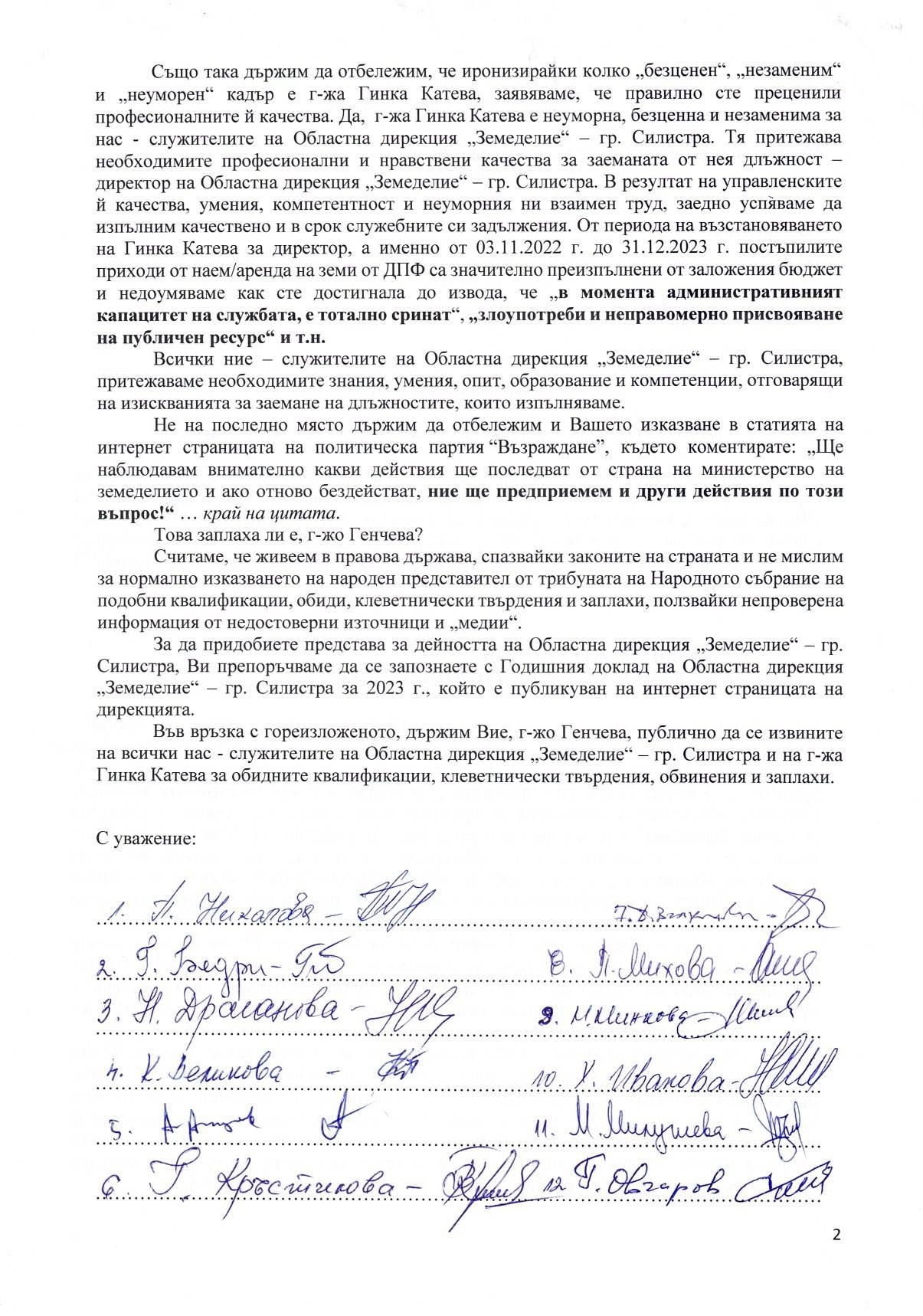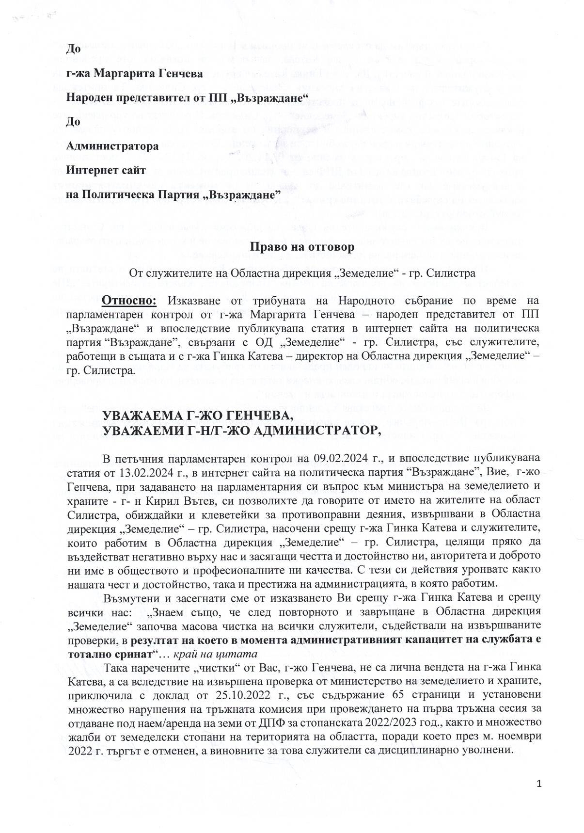 40 служители на Служители на Областната дирекция в Силистра и земеделски производители от региона разпространиха право на отговор на изказване на Маргарита Генчева по време на петъчния парламентарен контрол.