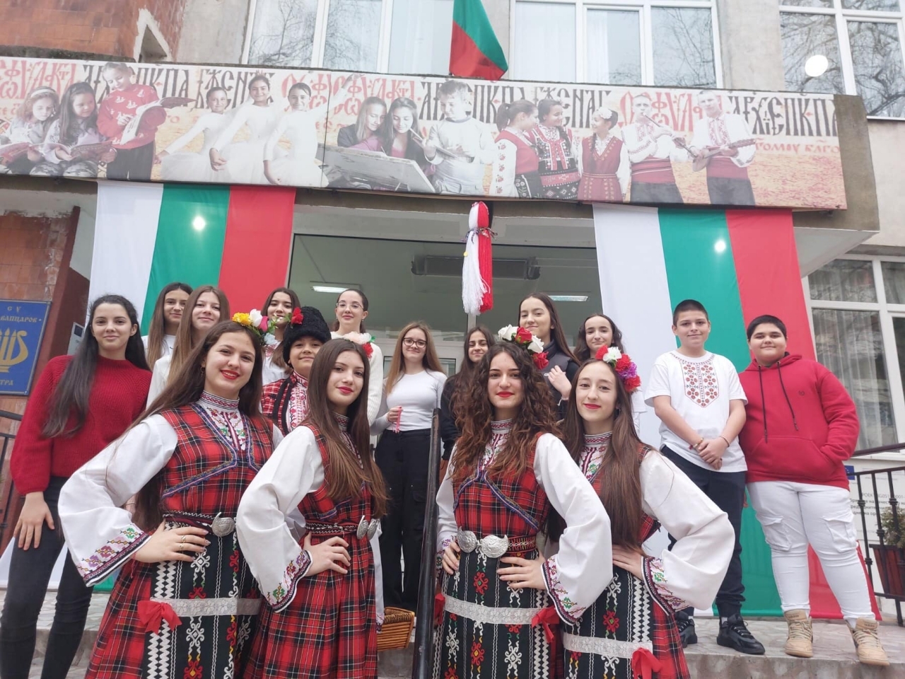 Рано сутринта на 1 март учениците посрещаха гостите на училището с мартеници, пожелавайки им здраве и късмет. Те бяха изработили и красиви книгоразделители с български шевици, с които подариха пролетно настроение на всички.