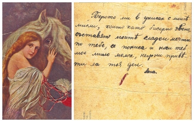 На гърба на картичката младата подателка изпраща послание до любимия си човек. "Перото ми в унисон с моите мисли, които като бисерно звено съставят моите сладки мисли по тебе, се понася и носи теб, мое мило момче, нежни привети за тоя ден. Лена."