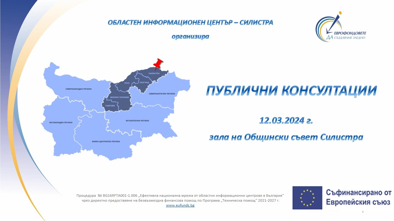 На 12 март 2024 г. (вторник), от 10:00 ч., в залата на Общински съвет Силистра ще се състои публична дискусия по КИТИ №BG16FFPR003-2.001-0041 "Грижа за хората чрез осигуряване на транспортна свързаност, достъп до качествени публични (образователни и социални) услуги, подобряване на градската среда, култура и туризъм, балансиращи и насърчаващи междупоколенческата и междуетническа равнопоставеност в общините Силистра и Тутракан" с водещ партньор Община Силистра. Събитието е организирано от Областен информационен център (ОИЦ) – Силистра като част от Звеното за публични консултации към Регионалния съвет за развитие (РСР) за Северен централен регион за планиране (СЦР). Поканени за участие са партньорите в концепцията, представители на местната власт, както и всички заинтересовани страни и широката общественост. По време на събитието ще бъдат представени отделните проекти, които са все още идеи и предстои да преминат последваща оценка.