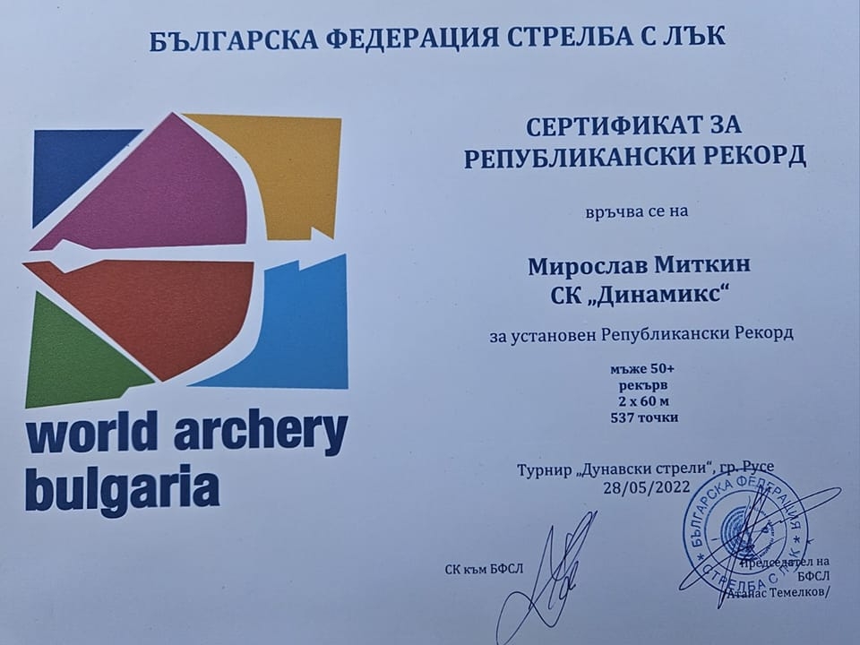 По време на квалификационните кръгове специално внимание привлече представянето на инж. Мирослав Миткин от Спортен клуб по стрелба с лък "Динамикс" Силистра. Като част от турнира той имаше удоволствието да получи сертификат за поставен от него Републикански рекорд на Турнира "Дунавски стрели", проведен в Русе на 28 май 2022 г. В тази забележителна изява инж. Миткин постигна впечатляващите 537 точки в дисциплината Рекърв 2 x 60 m при мъже 50+, поставяйки нов национален рекорд.