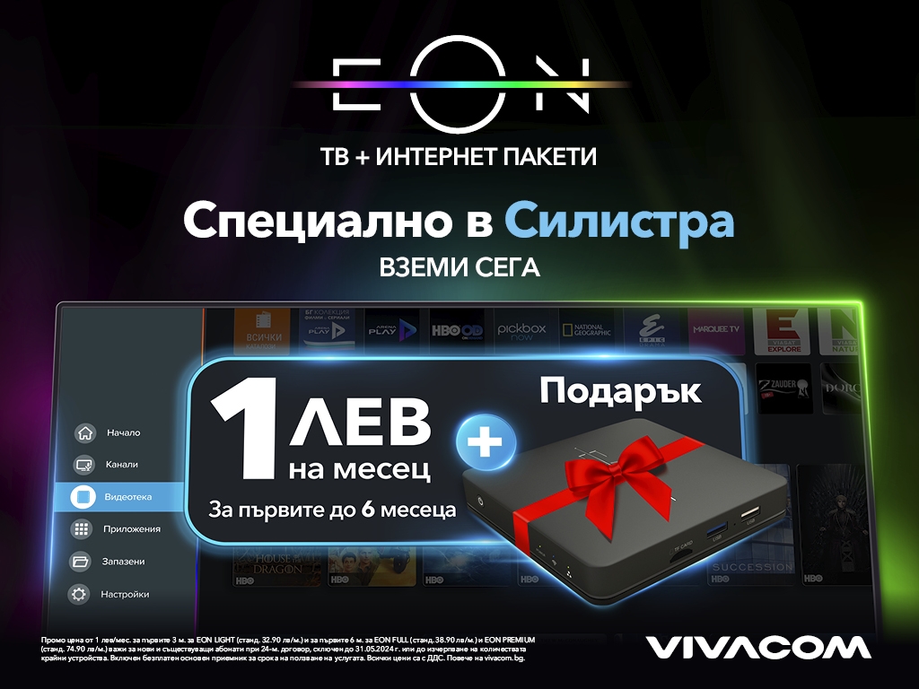 12 март 2024 г. Vivacom предлага специална оферта за жителите на Силистра – потребителите могат да получат иновативната ТВ платформа EON в комбинация със супер бърз интернет само за 1 лв. на месец за първите до 6 месеца с подарък приемник. Те имат достъп до уникално телевизионно изживяване с над 210 ТВ канала, най-голямата видеотека в България*, включваща каталозите HBO On Demand, Arena Play, Pickbox NOW и много други, както и възможност за връщане на ТВ съдържание до 7 дни назад.