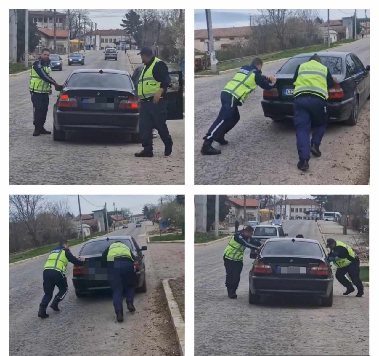 Униформените от клипа са автоконтрольор Тунджай Фучиджи и младши полицейски инспектор Георги Симеонов, служители на РУ-Тутракан. Днес, в рамките на специализирана полицейска операция, в село Нова Черна двамата извършили проверка на лек автомобил, след която поради проблем с акумулатора водачът не успял да потегли. Без колебание двамата полицейски служители избутали закъсалата кола и помогнали на водача и спътника му. Не смятат постъпката си за нещо изключително, определят я като част от всекидневните си задължения да се грижат за безопасността на движението и да са в помощ на хората.