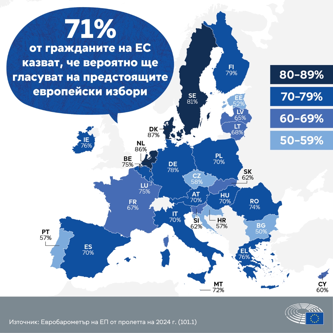 71% от гражданите на ЕС заявяват, че вероятно ще гласуват (7 до 10 по скала от 1 до 10), което представлява увеличение от +3 процентни пункта в сравнение с есента на 2023 г. и +10 процентни пункта в сравнение с проучването от февруари/март 2019 г. Националните резултати по този показател сочат, че 50% от българските граждани заявяват, че вероятно ще гласуват (7 до 10 по скала от 1 до 10), като се отчита намаление от 1 процентен пункт спрямо есента на 2023 г. и -7 процентни пункта в сравнение с февруари/март 2019г., което, заедно с Естония (52%), представлява най-ниската стойност сред държавите членки.