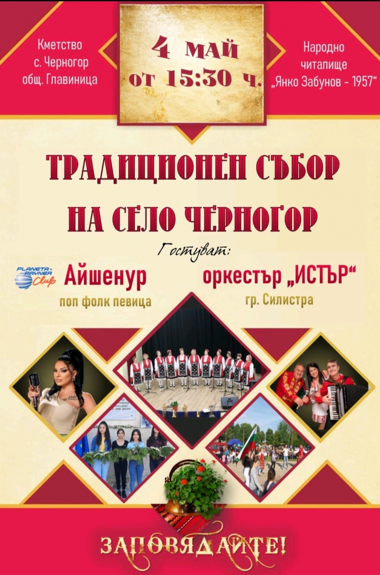 На 4 май (събота) село Черногор, община Главиница, ще се огласи от песни и танци по време на традиционния си събор. Събитието ще се проведе на площада пред Народно читалище "Янко Забунов - 1957" от 15:30 часа.
