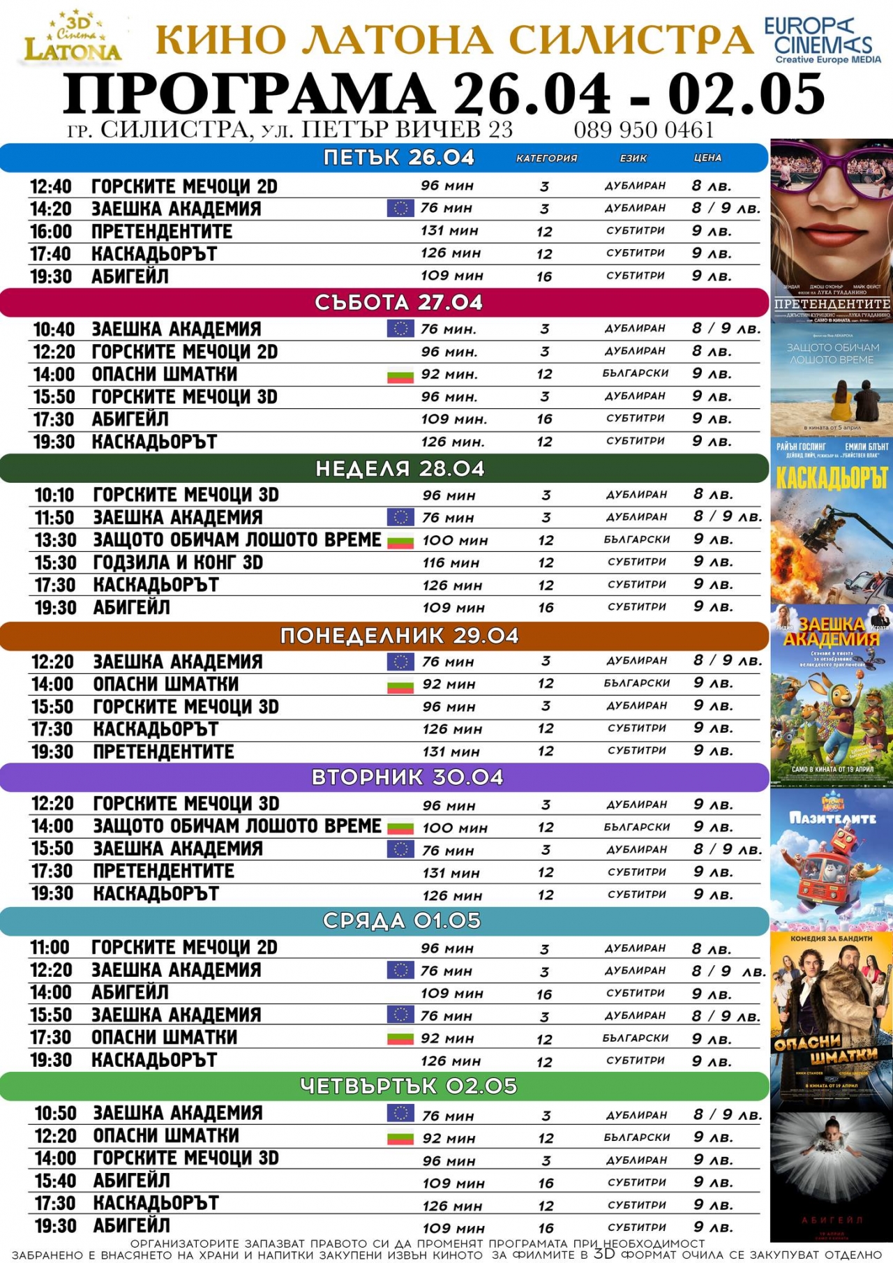 В новата програма на Latona Cinema - Силистра от петък, 26.04, ще намерите разнообразни нови филми - гледайте Зендая в "ПРЕТЕНДЕНТИТЕ"; Раян Гослинг и Емили Блънт в "Каскадьорът"; най-новите български филми "ОПАСНИ ШМАТКИ" и "ЗАЩОТО ОБИЧАМ ЛОШОТО ВРЕМЕ"; "ГОРСКИТЕ МЕЧОЦИ" и "ЗАЕШКА АКАДЕМИЯ" за малките зрители!