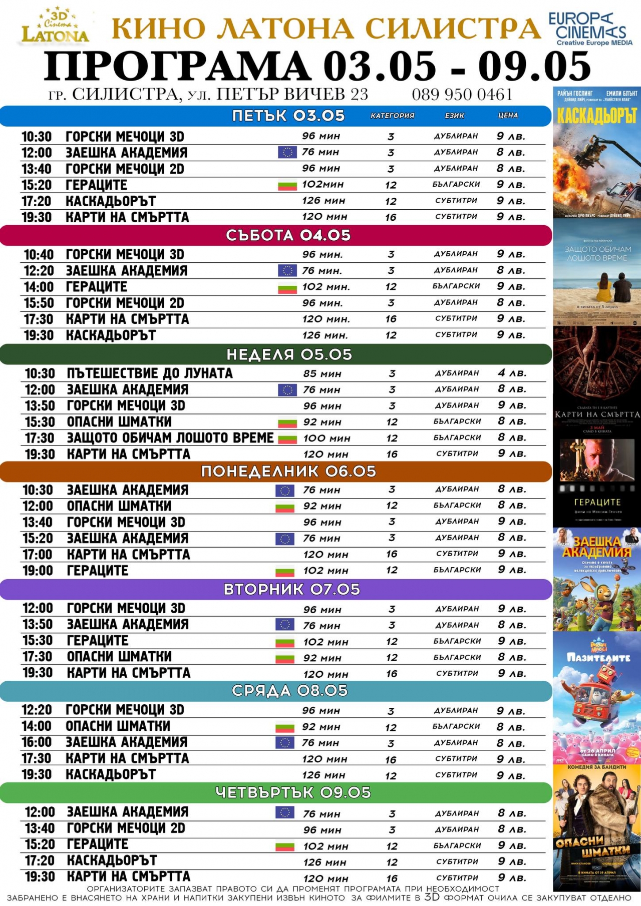 От днес петък 03 МАЙ очаквайте в програмата на Latona Cinema - Силистра - премиера на българския филм "ГЕРАЦИТЕ"! "КАРТИ НА СМЪРТТА" е новият филм на ужасите за най-смелите, а за малките зрители имаме "ГОРСКИ МЕЧОЦИ", "ЗАЕШКА АКАДЕМИЯ" и "ПЪТЕШЕСТВИЕ ДО ЛУНАТА"!