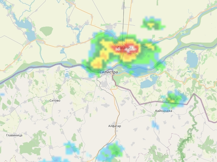 Метеорадарът в Шумен показва, че гръмотевична буря се приближава към област Силистра от посока румънския град Кълъраш.