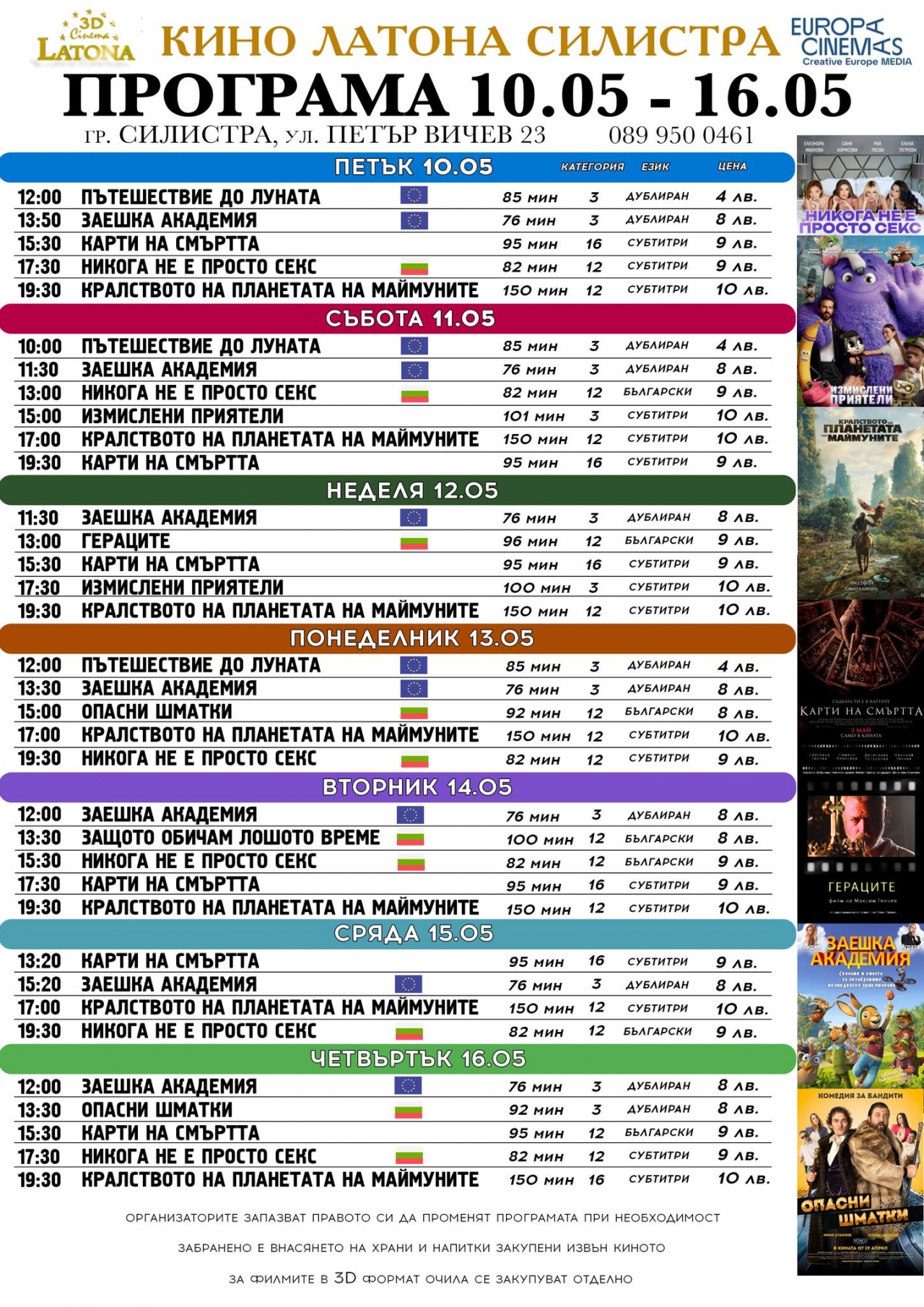 В новата програма на Latona Cinema - Силистра от петък, 10 МАЙ, ще откриете новия български филм "НИКОГА НЕ Е ПРОСТО СЕКС"; големият хит "КРАЛСТВОТО НА ПЛАНЕТАТА НА МАЙМУНИТЕ"; фантастичният "ИЗМИСЛЕНИ ПРИЯТЕЛИ" и анимационните "ПЪТЕШЕСТВИЕ ДО ЛУНАТА" и "ЗАЕШКА АКАДЕМИЯ"!