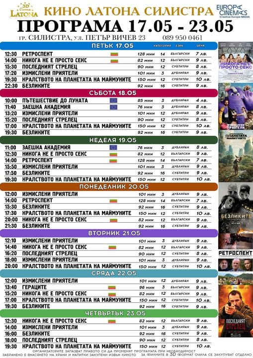 В новата програма на Latona Cinema - Силистра от петък, 17 МАЙ, ще откриете новия драматичен български филм "РЕТРОСПЕКТ" и хитовия "НИКОГА НЕ Е ПРОСТО СЕКС"; сръбския екшън "ПОСЛЕДНИЯТ СТРЕЛЕЦ"; за феновете на ужасите предизвикателството е "БЕЗЛИКИТЕ"; озвучените на български "ИЗМИСЛЕНИ ПРИЯТЕЛИ", "ЗАЕШКА АКАДЕМИЯ" и "ПЪТЕШЕСТВИЕ ДО ЛУНАТА"!