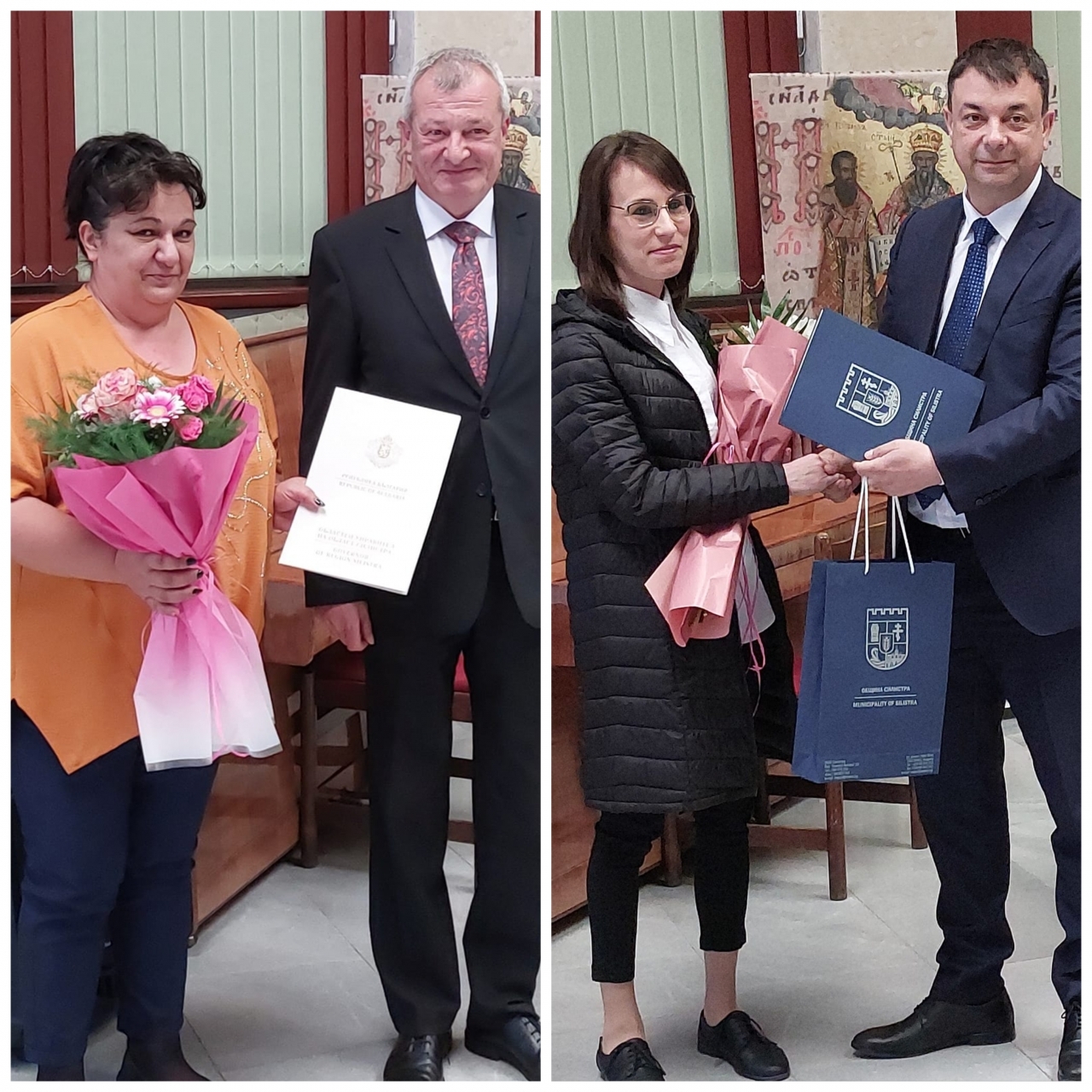 Нели Димитрова получи наградата на областния управител за отличен успех през целия курс на обучение, а Илияна Петрова - наградата на кмета като студентка-майка с най-висок успех по време на следването.
