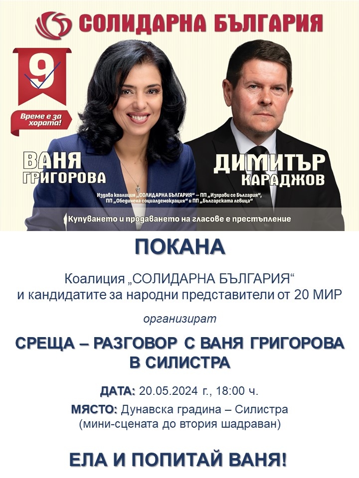 Кандидатите за народни представители от Коалиция "СОЛИДАРНА БЪЛГАРИЯ" в 20 МИР канят обществеността на Силистра на СРЕЩА - РАЗГОВОР С Ваня Григорова.