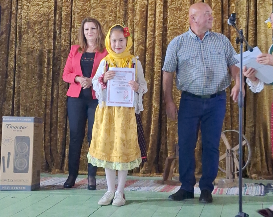 9-годишната Никол Николаева, възпитаничка на Музикална студия "ДО РЕ МИ" с ръководител Пламен Скорчелиев, е спечелила първо място в първа възрастова група на конкурса "С песните на Васила Вълчева" в село Калипетрово.