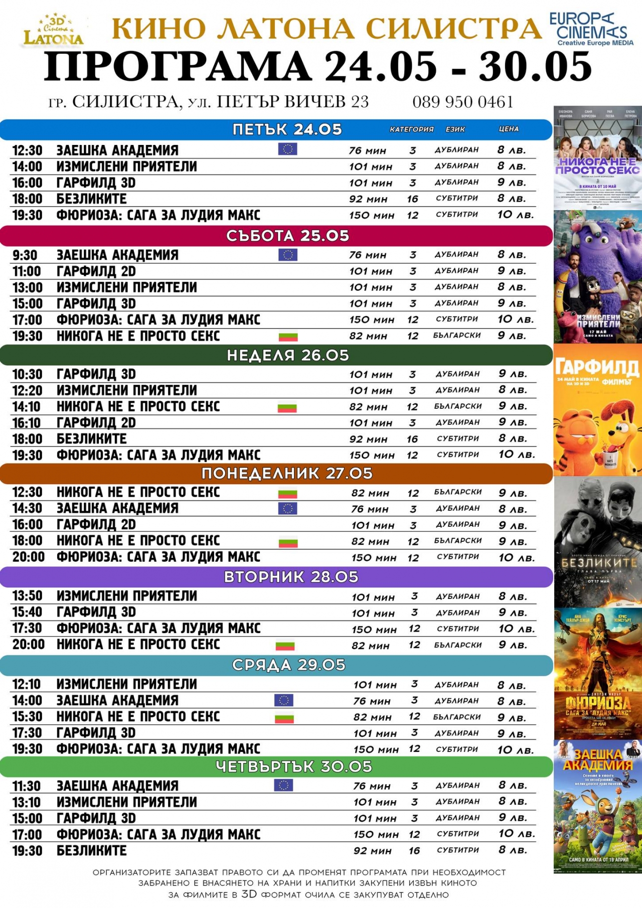 Очаквайте в новата програма на Latona Cinema - Силистра от 24 МАЙ: "ФЮРИОЗА: САГА ЗА ЛУДИЯ МАКС" е епичното продължение на историята с уч. на Крис Хемсуърт и Аня Тейлър - Джой; най-забавният котарак "ГАРФИЛД" идва в 2D и 3D, озвучен на български; "ИЗМИСЛЕНИ ПРИЯТЕЛИ" е специално за хората с развинтено въображение, а "БЕЗЛИКИТЕ" за най-смелите почитатели на ужасите!