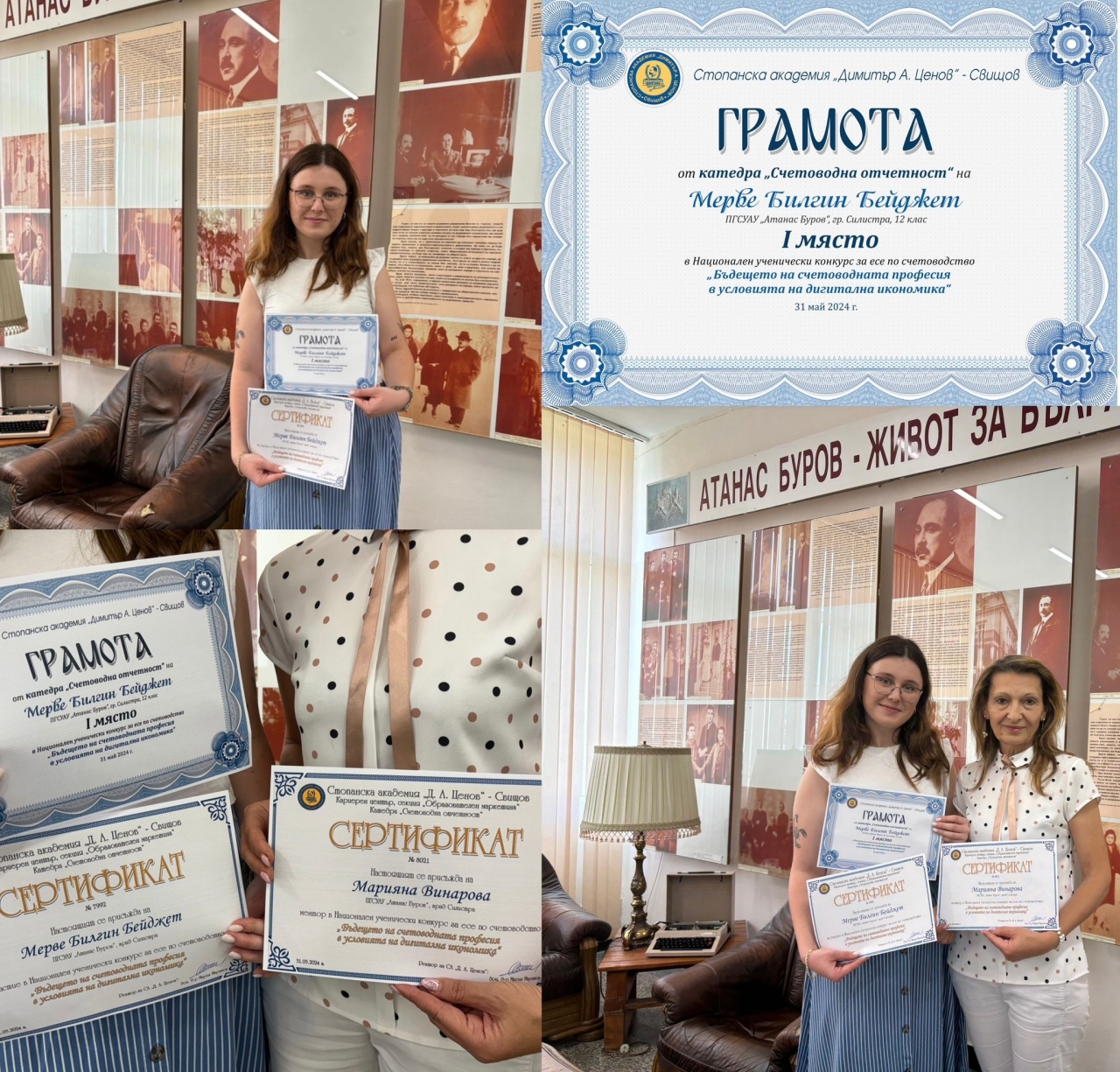 Мерве Билгин от 12.б клас, специалност "Малък и среден бизнес" за пореден път демонстрира задълбочено разбиране за въздействието на новите технологии върху счетоводството и значението на иновациите като изкуствен интелект, автоматизация и блокчейн технологии. В разработката си тя акцентира върху необходимостта от адаптация и непрекъснато обучение на счетоводителите, за да могат те успешно да отговорят на новите изисквания и предизвикателства. За показаната креативност и оригиналност журито отличи младата буровка с Първо място , Грамота и прием в СА Свищов. Сертификат получи и нейният ментор г-жа Марияна Винарова, главен учител по професионална подготовка в гимназията.