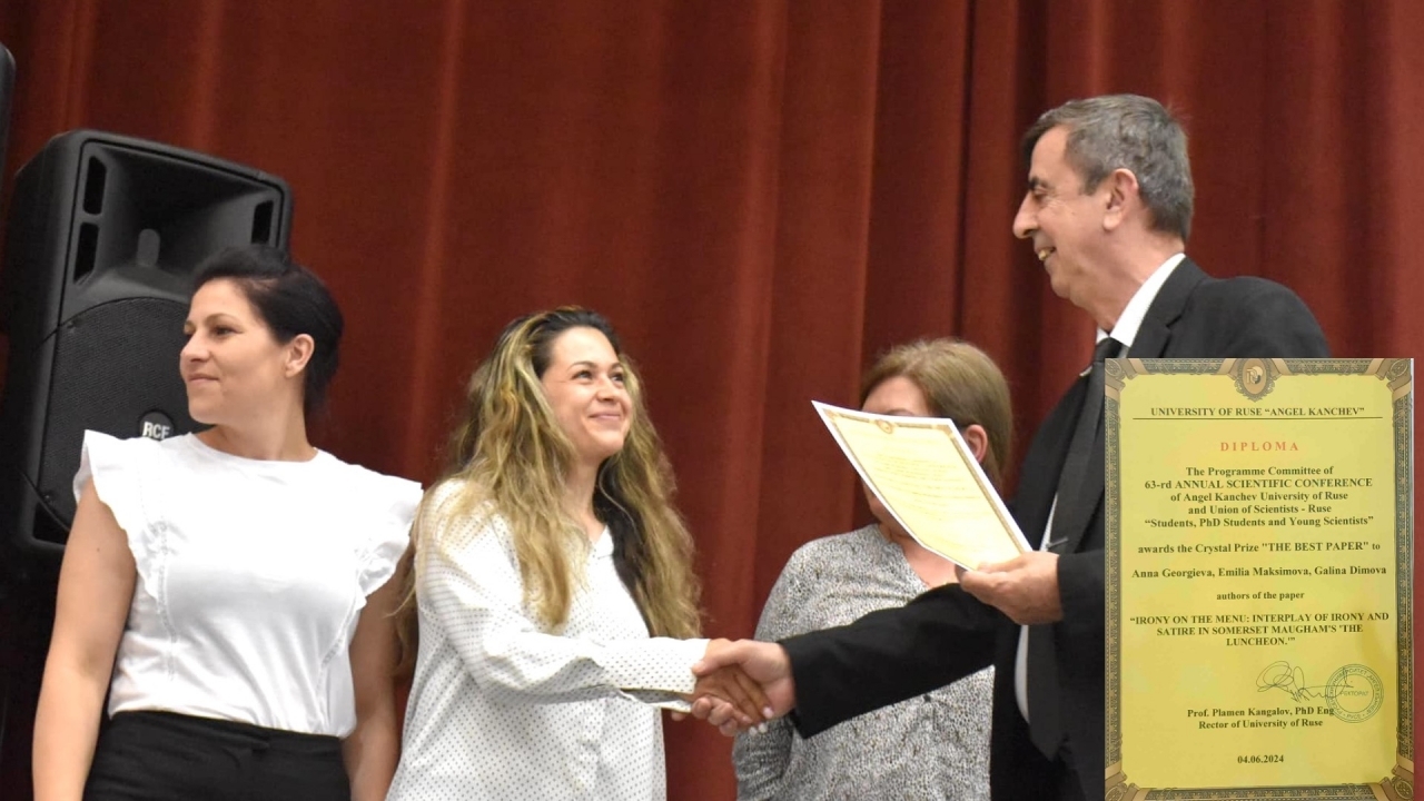 Три студентки от Филиал Силистра, специалност "Педагогика на обучението по български и английски език" - Анна Георгиева, Емилия Максимова и Галина Димова участваха в заключителната сесия на студентската научна конференция – Best Paper’24. Те представиха своята разработка на английски език, третираща стилистичните особености на британския хумор в разказа "Обядът" на Самърсет Моъм. Техният доклад беше излъчен от научното жури на проведените през месец май "Пролетни празници на науката" и студентска научна сесия във Филиал Силистра. Научната им работа получи престижната университетска награда Кристален приз.