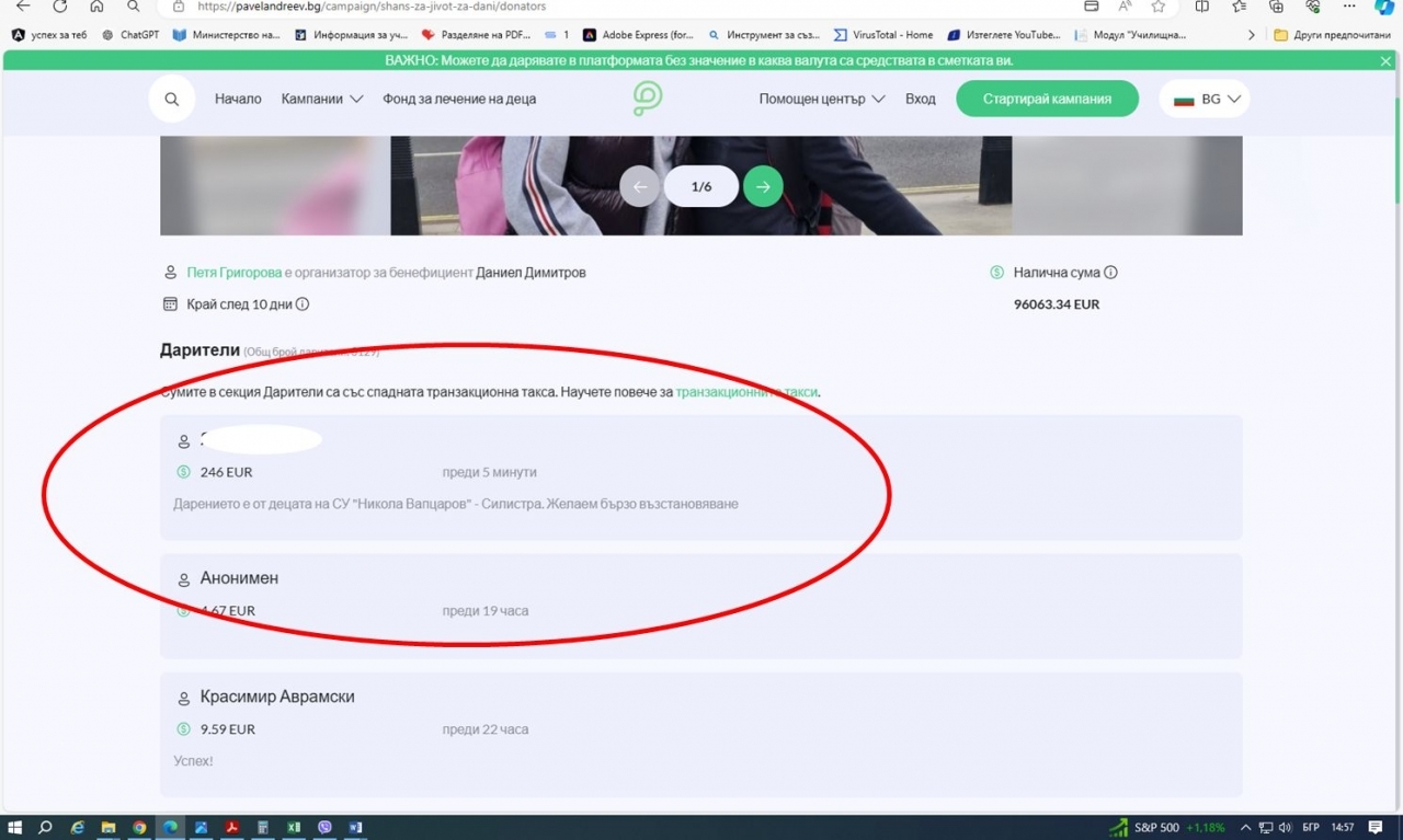 Средно училище "Никола Й. Вапцаров" в Силистра съобщи, че вчера са превели по дарителската сметка на Дани 500 лв., събрани в рамките на благотворителната инициатива, подета от четвъртокласниците. Тази инициатива, насочена към подпомагане на лечението на Дани, е поредното доказателство за съпричастността и добротата на учениците и техните учители.