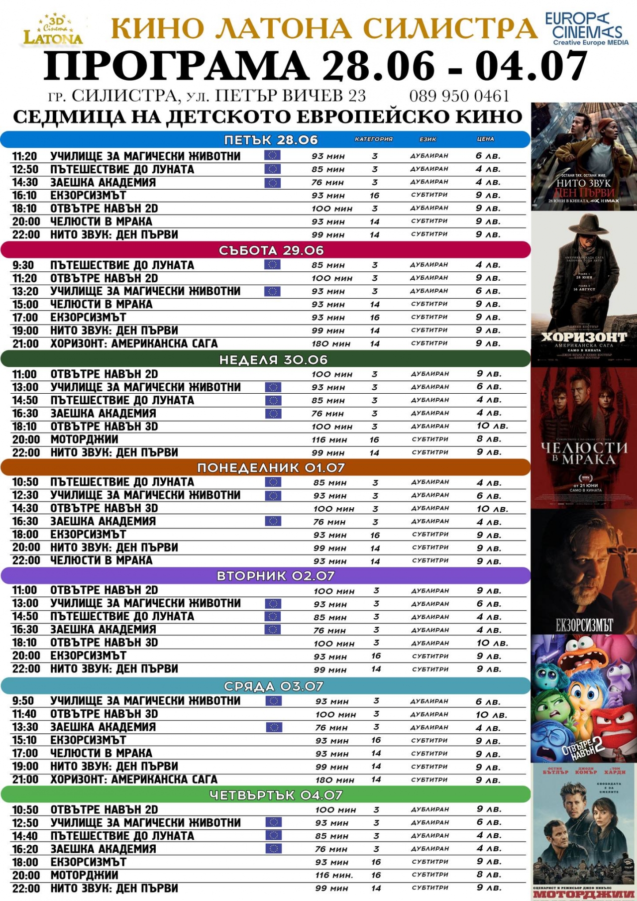 Предстои СЕДМИЦА НА ДЕТСКОТО ЕВРОПЕЙСКО КИНО в Latona Cinema - Силистра! Забавлявайте се с любими анимации или пък се насладете на дългоочаквания "ХОРИЗОНТ: АМЕРИКАНСКА САГА Глава 1" с Кевин Костнър; драматичната фантастика "НИТО ЗВУК: ДЕН ПЪРВИ"; ужасяващият "ЧЕЛЮСТИ В МРАКА" с Никълъс Кейдж.