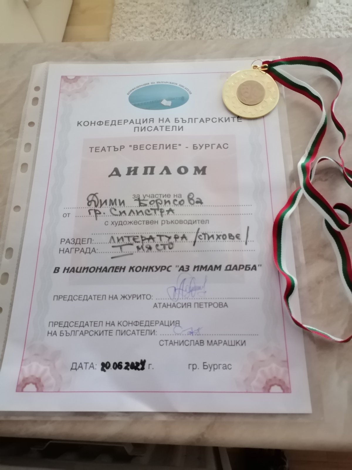 Националният конкурс "Аз имам дарба", организиран от Конфедерация на българските писатели и Театър "Веселие", донесе първо място на Дими Борисова (Димитричка Георгиева) от Силистра. Тя бе отличена за своето стихотворение "Армагедон", вдъхновено от пандемията 2020-2023 г.