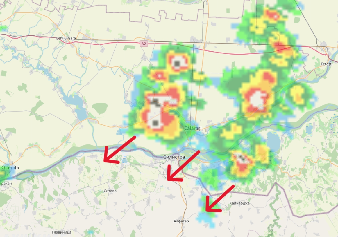 Метеорологичният радар в Шумен показва, че няколко буреносни клетки се движат от североизток към Силистра. Вече заваля първия дъжд.