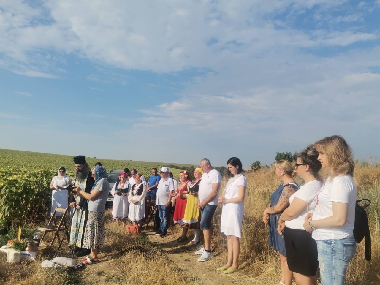 Свещеникът от храма "Света Троица" в селото, протойерей Георги Попов, извърши службата до полето със слънчогледи в присъствието на местните жители.