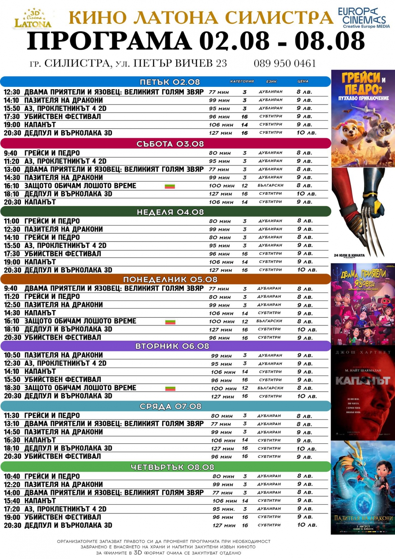 Киноманите в Силистра ще могат да се насладят на свежа порция филмови заглавия в Latona Cinema, започващи от 02 август. Разнообразието от жанрове гарантира нещо за всеки вкус, включително за любителите на напрегнатите сценарии и анимационните приключения.