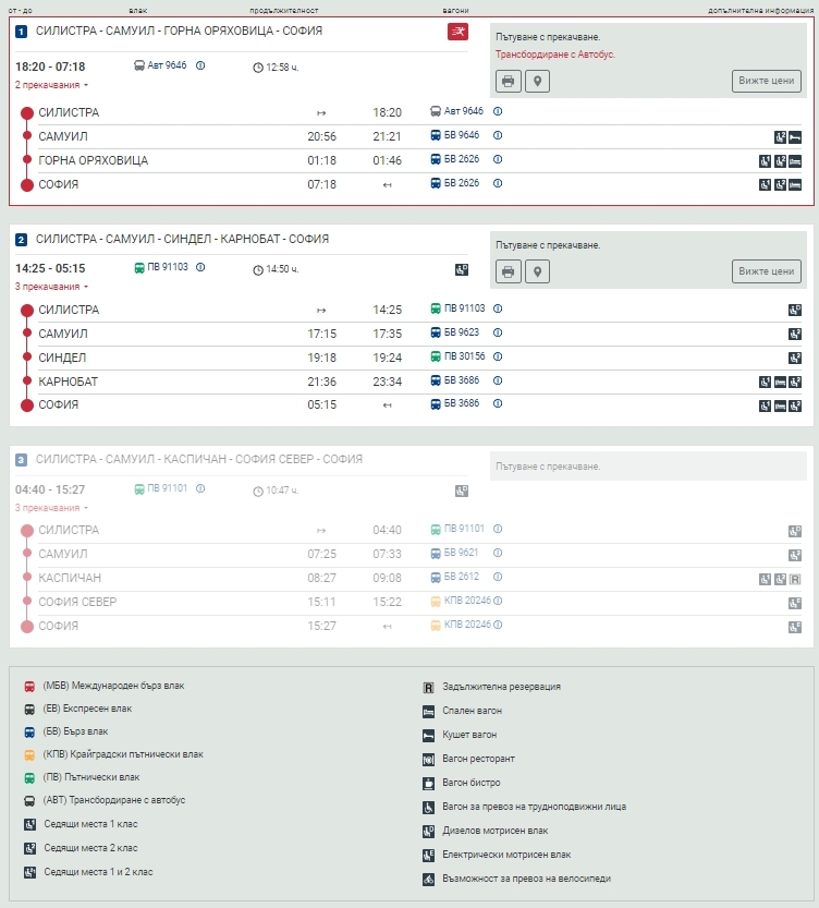 Пътуването вече изисква няколко прекачвания и са тестване на търпението на пътниците с продължителността си. Един от маршрутите, например, изисква начало на пътуването в 18:20 ч. от Силистра, последвано от няколко прекачвания в Горна Оряховица и пристигане в София на следващия ден в 07:18 ч. Общото време на пътуване достига почти 13 часа. Освен дългото пътуване, започващо в 18:20 ч., пътниците от Силистра до София имат на разположение и други маршрути. Втори маршрут предлага тръгване в 14:25 ч. и пристигане в София в 05:15 на следващия ден с прекачвания в Самуил, Синдел и Карнобат, като общото време на пътуване е около 15 часа. Друга алтернатива е да се тръгне в 04:40 ч., с прекачвания в Самуил и Каспичан, и да се пристигне в София в 15:27 ч., което прави общо време на пътуване приблизително 11 часа.
