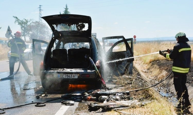 Днес на международния път Е-80 край Хасково, лек автомобил "Крайслер Круизер" се самозапали в движение.