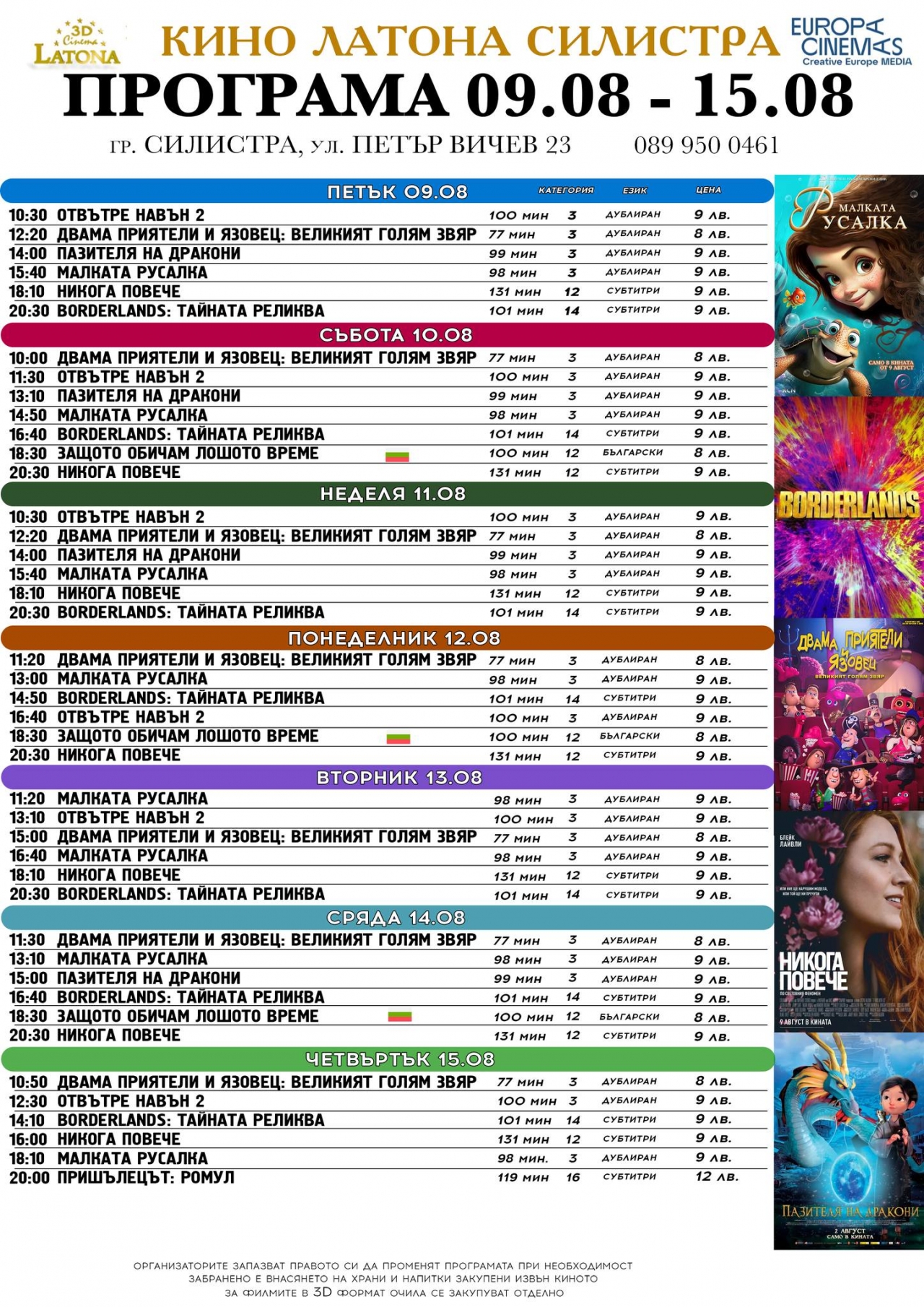 Latona Cinema в Силистра предлага богата детска програма това лято. Можете да се насладите на прожекции като "Малката русалка" по Х.К. Андерсен, "Двама приятели и язовец: Великият голям звяр", и "Пазителят на дракони". За по-големите зрители се предлагат и филми като "Отвътре навън 2", трилърът "Никога повече" с Блейк Лайвли, и приключенският филм "Borderlands: Тайната реликва".