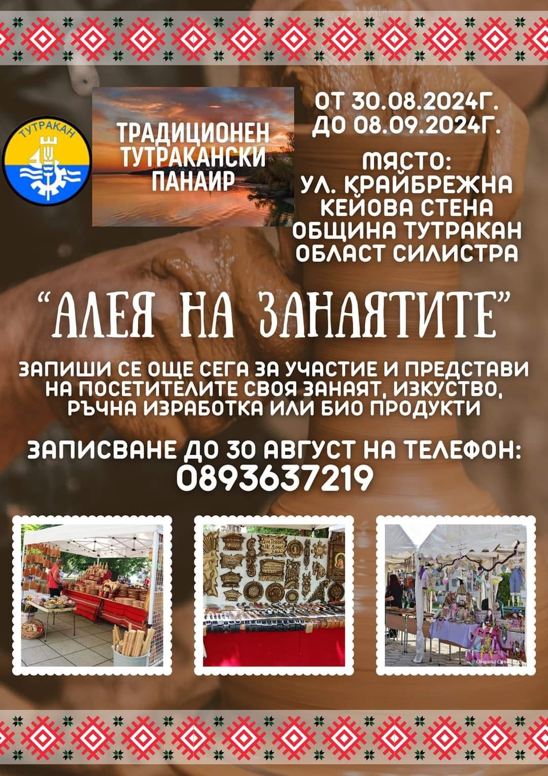 От 30 август до 8 септември 2024 г. в Тутракан ще се проведе традиционният Тутракански панаир, който ще събере занаятчии, творци и любители на ръчно изработени изделия от цялата страна. Събитието ще се състои на ул. Крайбрежна, Кеийова стена, и ще включва популярната "Алея на занаятите", където посетителите ще имат възможност да се запознаят с различни занаяти, изкуства и био продукти.