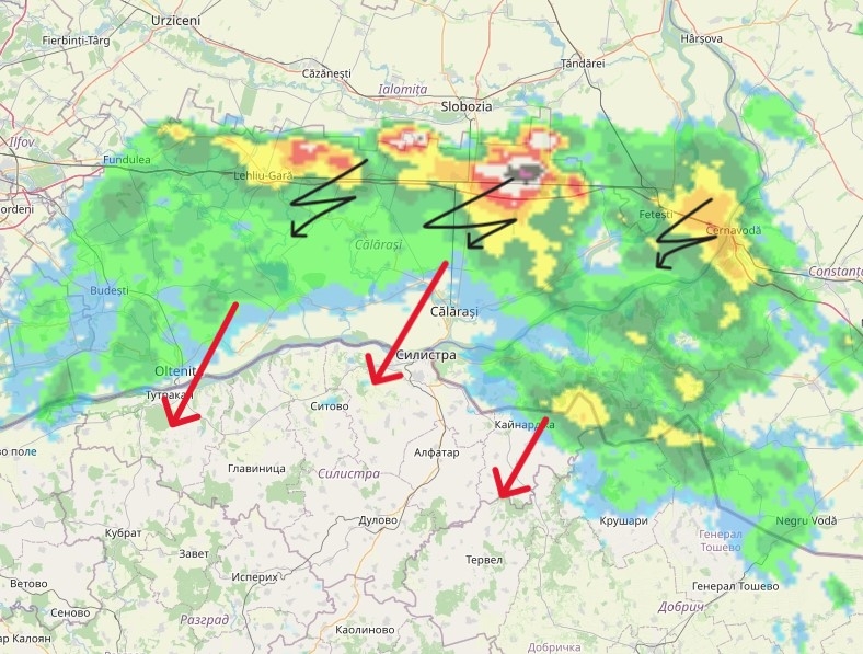 Група гръмотевични бури се приближават към Дунавската равнина и района на Силистра от север. В съседния румънски град Кълъраш вече са паднали обилни валежи, а метеоролозите предупреждават, че на места в Силистренския регион също се очакват значителни количества дъжд в близките часове.